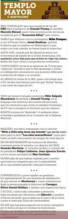 HABLÓ por teléfono con su contraparte, Mike Pompeo, y con el Primer Yerno, Jared Kushner, quienes le dijeron que no estaban en Washington y que, mejor con más calmita, se vieran hasta el miércoles. (F. Bartolomé, Reforma, Opinión, p. 8)