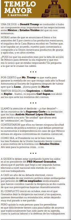 El canciller Marcelo Ebrard y su equipo lograron lo que ya muchos daban por tiempo y esfuerzo perdido. Las negociaciones y promesas de endurecer por parte de México su política migratoria surtieron efecto y lograron apaciguar la furia del inquilino de la Casa Blanca. De manera indefinida ha suspendido el gobierno de Donald Trump la aplicación de aranceles comerciales a los productos mexicanos que intentaran comercializarse en Estados Unidos a partir del lunes próximo. (Editorial, El Universal, Opinión, p. A12)