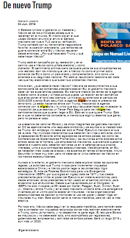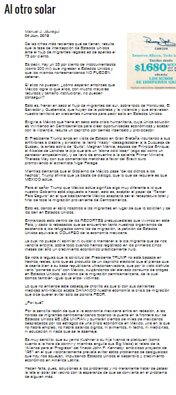 ¿Qué debería hacer México? Más allá de acostumbrarnos a que somos parte de las contiendas presidenciales en EU, el gobierno mexicano debe ver las experiencias pasadas. EU siempre mezcla los temas de la agenda bilateral como le place y lo hace porque puede. La relación es tan asimétrica que ellos ponen el tono casi siempre. Lo hicieron durante todo el periodo de 2000-2008 cuando Bush securitizó la agenda migratoria bajo el pretexto del terrorismo. Lo están haciendo ahora con Trump, mezclando la agenda comercial con la migratoria y lo único que aquí se puede hacer es no aceptar la imposición de que seamos un Tercer País Seguro para los inmigrantes centroamericanos que quieren llegar a EU. Esto es lo que quiere Trump. Esto es lo que no deberíamos concederle, a menos que algo tuviésemos que ganar, pero no parece el caso. (Genaro Lozano, Reforma, p. 9)