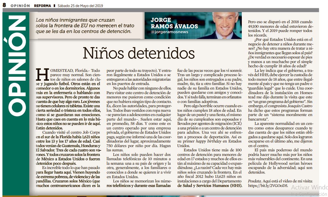 Cuando visité el centro Job Corps en el sur de la Florida había 1,621 niños entre los 13 y los 17 años de edad. Casi todos venían de Guatemala, Honduras y El Salvador. Tres de cada cuatro son varones. Y todos cruzaron solos la frontera de México a Estados Unidos o fueron detenidos poco después. Es increíble todo lo que han pasado para llegar hasta aquí. Vienen huyendo de extrema pobreza, de violencia y de las pandillas. Cruzaron solos México (que muchos centroamericanos dicen es la peor parte de todo su trayecto Y entraron ilegalmente a Estados Unidos o se entregaron a las autoridades migratorias en los puertos de entrada. No pude hablar con ninguno de ellos. Para visitar este centro de detención de menores me pusieron como condición que no hubiera ningún tipo de contacto. Es, dicen las autoridades, para protegerlos. Todos iban vestidos con ropa nueva -se parecían a adolescentes en cualquier parte del mundo Suelen estar aquí, en promedio, 58 días. Y como este es un centro operado por una empresa privada, el gobierno de Estados Unidos paga, según me informó una de las coordinadoras del lugar, aproximadamente 750 dólares por niño por día. (Jorge Ramos Ávalos, Reforma, p.8)