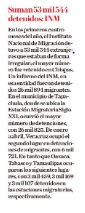 En los primeros cuatro meses del año, el Instituto Nacional de Migración detuvo a 53 mil 544 extranjeros que estaban de forma irregular; el mayor número fue retenido en Chiapas. Un informe del INM, en esa entidad fueron detenidos 26 mil 894migrantes. En el municipio de Tapachula, donde se ubícala Estación Migratoria Siglo XXI, ocurrió el mayor número de detenciones, con 26 mil 825. De enero a abril, Veracruz ocupó el segundo lugar en detenciones de migrantes, con 6 mil 721. En tanto que Oaxaca, Tabasco y Tamaulipas ocuparon los siguientes lugares, con 3 mil459,3 mil 169 y 3 mil 107 detenidos en las estaciones migratorias, respectivamente. (Redacción, Milenio Diario, p. 8)