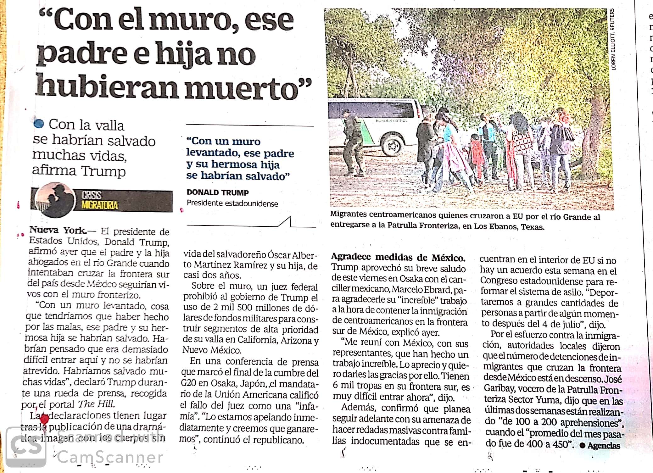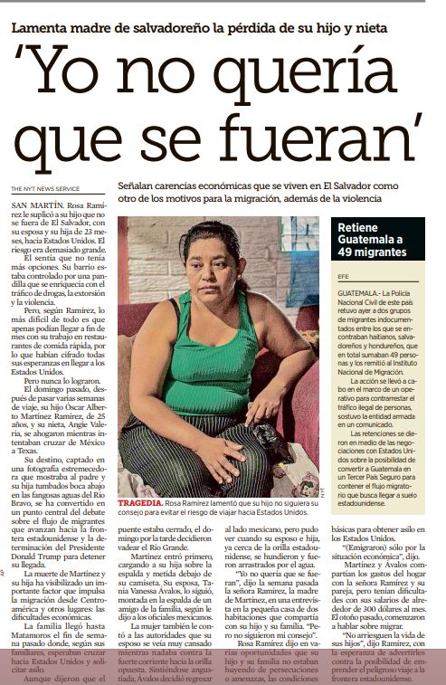 Pero nunca lo lograron. El domingo pasado, después de pasar varias semanas de viaje, su hijo Óscar Alberto Martínez Ramírez, de 25 años, y su nieta, Angie Valeria, se ahogaron mientras intentaban cruzar de México a Texas. Su destino, captado en una fotografía estremecedora que mostraba al padre y su hija tumbados boca abajo en las fangosas aguas del Río Bravo, se ha convertido en un punto central del debate sobre el flujo de migrantes que avanzan hacia la frontera estadounidense y la determinación del Presidente Donald Trump para detener su llegada. (The NYT News Service, Reforma, Internacional, p. 15)