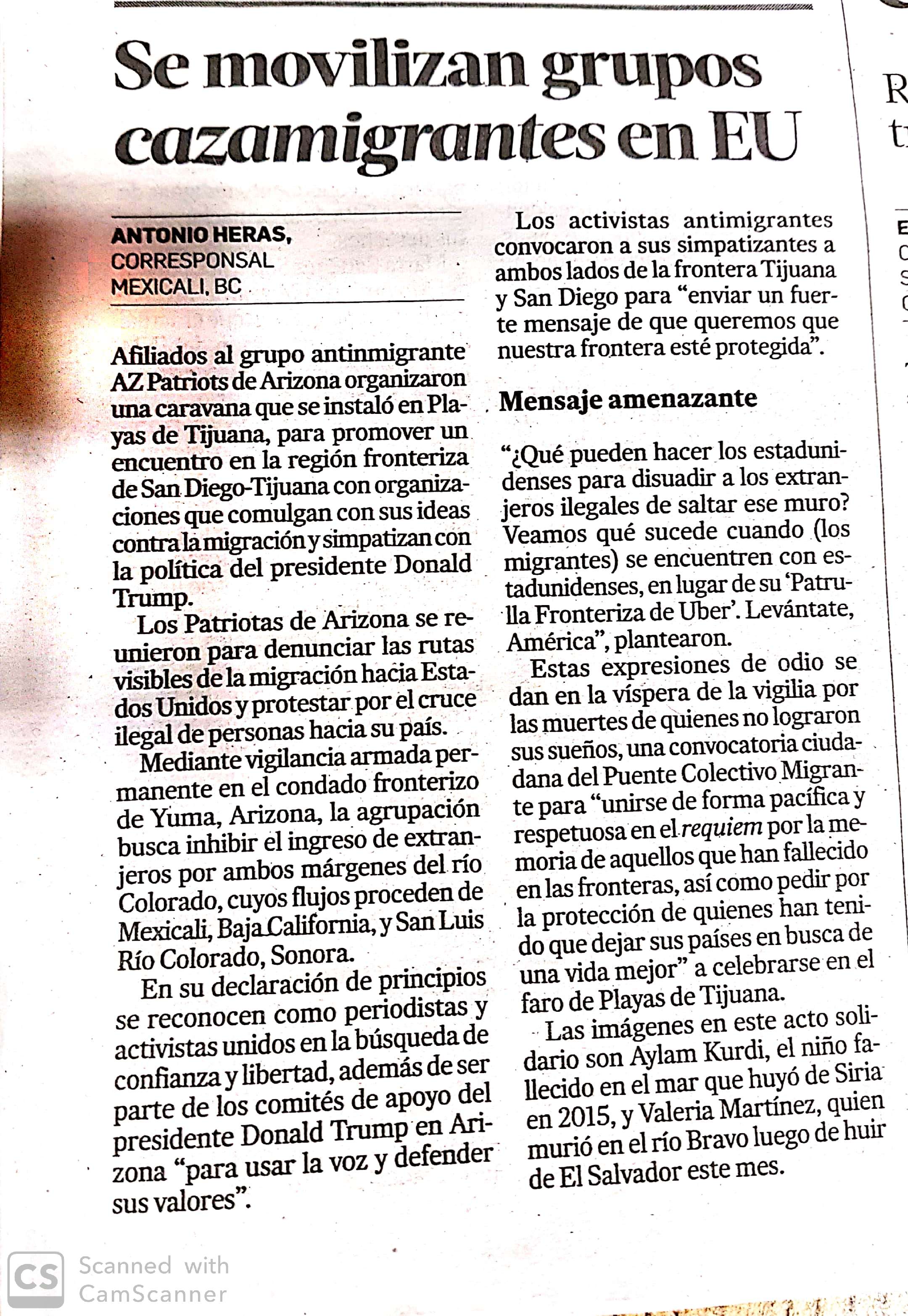 Afiliados al grupo antimigrantes AZ Patriots de Arizona organizaron una caravana que se instaló en Playas de Tijuana, para promover un encuentro en la región fronteriza de San Diego – Tijuana con organizaciones que comulgan con sus ideas contra la migración y simpatizan con la política del presidente Donald Trump. Los Patriots de Arizona se reunieron para denunciar las rutas visibles de la migración hacia Estados Unidos y protestar por el cruce ilegal de personas hacia su país. Mediante vigilancia armada permanente en el condado fronterizo de Yuma, Arizona, la agrupación busca inhibir el ingreso de extranjeros por ambos márgenes del río Colorado, cuyos flujos proceden de Mexicali, Baja California, y San Luis Río Colorado, Sonora. (Antonio Heras, La Jornada, Política, p. 11)
