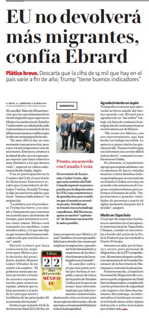 Tras su participación en la Cumbre del G20, el secretario de Relaciones Exteriores resaltó que el presidente de Estados Unidos, Donald Trump, le dijo en una breve plática que tiene “buenos indicadores” en migración. “La plática con el presidente Trump fue breve, y es simple y llanamente que tenemos un acuerdo para un término de tiempo, para sentarnos a revisar cómo vamos. México está tomando sus medidas, como ustedes saben, y lo que me dijo es que tenían ellos buenos indicadores de que van bien las cosas”, anotó. (V. Díaz, A. Jiménez y Agencias, Milenio, P.p.)