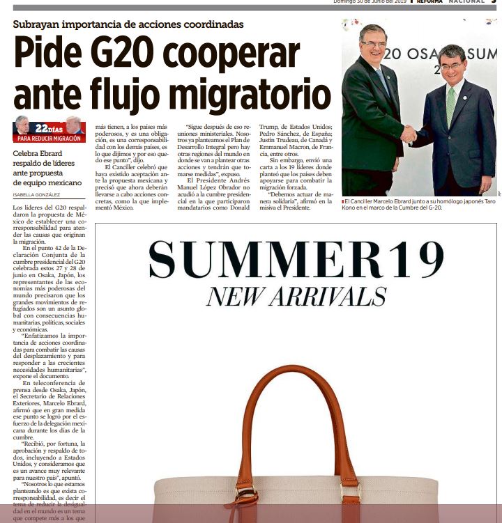 “Enfatizamos la importancia de acciones coordinadas para combatir las causas del desplazamiento y para responder a las crecientes necesidades humanitarias”, expone el documento. En teleconferencia de prensa desde Osaka, Japón, el Secretario de Relaciones Exteriores, Marcelo Ebrard, afirmó que en gran medida ese punto se logró por el esfuerzo de la delegación mexicana durante los días de la cumbre. (Isabella González, Reforma, Nacional, p. 3)