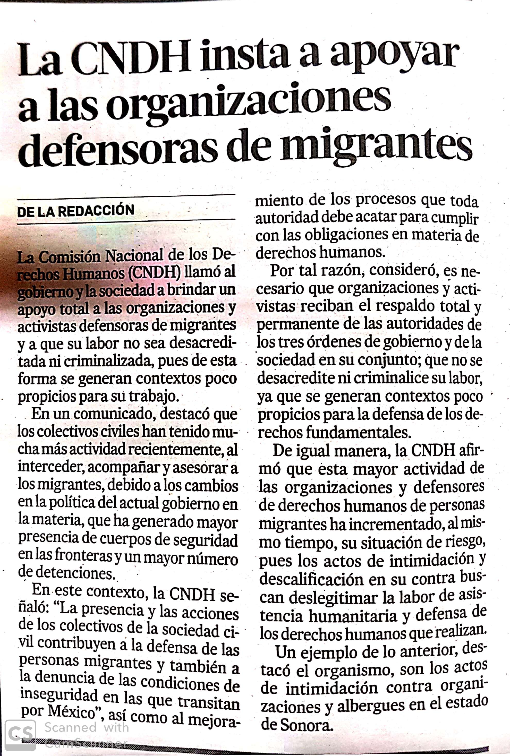 La Comisión Nacional de los Derechos Humanos (CNDH) llamó al gobierno y la sociedad a brindar un apoyo total a las organizaciones y activistas defensoras de migrantes y a que su labor no sea desacreditada ni criminalizada, pues de esta forma se generan contextos poco propicios para su trabajo. En un comunicado, destacó que los colectivos civiles han tenido mucha más actividad recientemente, al interceder, acompañar y asesorar a los migrantes, debido a los cambios en la política del actual gobierno en la materia, que ha generado mayor presencia de cuerpos de seguridad en las fronteras y un mayor número de detenciones. Por tal razón, consideró, es necesario que organizaciones y activistas reciban el respaldo total y permanente de las autoridades de los tres órdenes de gobierno y de la sociedad en su conjunto; que no se desacredite ni criminalice su labor, ya que se generan contextos poco propicios para la defensa de los derechos fundamentales. (Redacción, La Jornada, Política, p. 12)