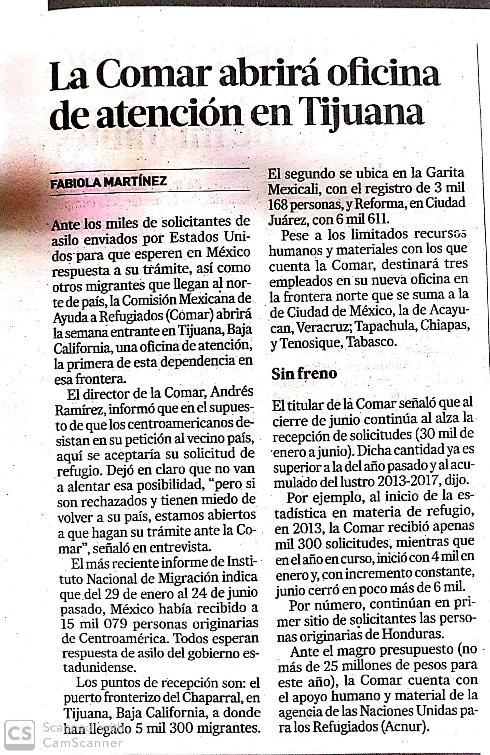 Ante los miles de solicitantes de asilo enviados por Estados Unidos para que esperen en México respuesta a su trámite, así como otros migrantes que llegan al norte del país, la Comisión Mexicana de Ayuda a Refugiados (Comar) abrirá la semana entrante en Tijuana, Baja California, una oficina de atención, la primera de esta dependencia en esa frontera. El director de la Comar, Andrés Ramírez, informó que en el supuesto de que los centroamericanos desistan en su petición al vecino país, aquí se aceptaría si solicitud de refugio. (Fabiola Martínez, La Jornada, Política, p. 11)