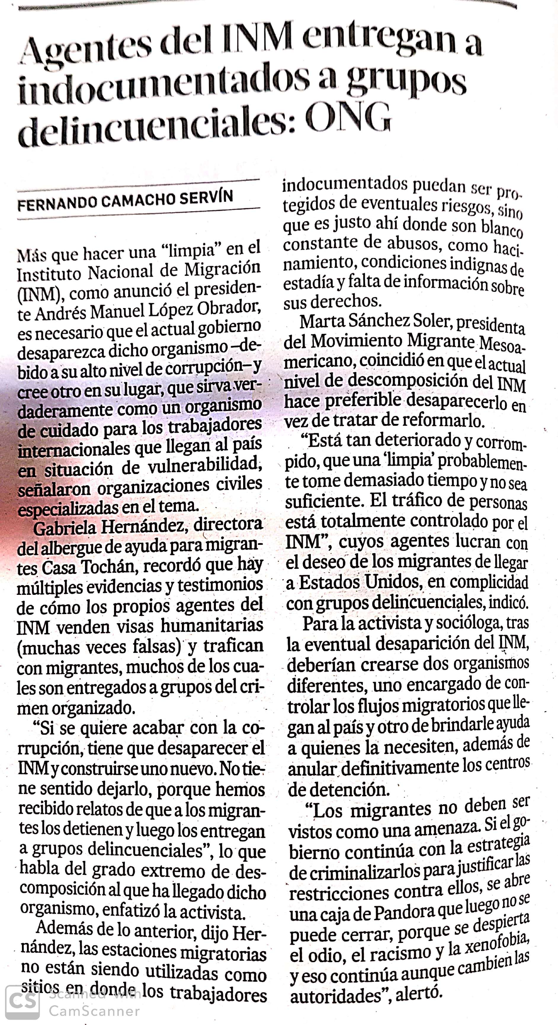 Más que hacer una limpia en el Instituto Nacional de Migración (INM) como anunció el presidente Andrés Manuel López Obrador, es necesario que el actual gobierno desaparezca dicho organismo -debido a su alto nivel de corrupción-y cree otro en su lugar, que sirva verdaderamente como un organismo de cuidado para los trabajadores internacionales que llegan al país en situación de vulnerabilidad, señalaron organizaciones civiles especializadas en el tema. Gabriela Hernández, directora del albergue de ayuda para migrantes Casa Tochán, recordó que hay múltiples evidencias y testimonios de cómo los propios agentes del INM venden visas humanitarias (muchas veces falsas) y trafican con migrantes, muchos de los cuales son entregados a grupos del crimen organizado. Si se quiere acabar con la corrupción, tiene que desaparecer el INM y construirse uno nuevo. No tiene sentido dejarlo, porque hemos recibido relatos de que a los migrantes los detienen y luego los entregan a grupos delincuenciales, lo que habla del grado extremo de descomposición al que ha llegado dicho organismo, enfatizó la activista. (Fernando Camacho Servín, La Jornada, Política, p. 12)
