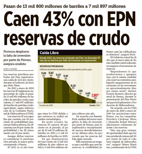 Cd. de México, México (19 abril 2019).- Las reservas petroleras probadas del País registraron una caída de 42.8 por ciento durante el Gobierno de Enrique Peña Nieto.