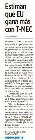 El análisis, ordenado por el Capitolio y que era esperado por legisladores estadounidenses que han condicionado su apoyo a la ratificación del acuerdo, estimó que las ventas de Estados Unidos a México subirían, sólo por efecto del T-MEC, 6.7 por ciento, o 14.2 mil millones de dólares, en el primer año de su implementación. (José Briseño, Reforma, P.p.)