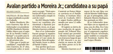 “Claro que sí (podrá ser candidato)”, respondió Moreira Guerrero, de 27 años, cuestionado sobre si nominará a su papá. “Tenía aprobación del 95 por ciento como Gobernador, rompió récord de votos”. (Rolando Chacón, Reforma, P.p.)